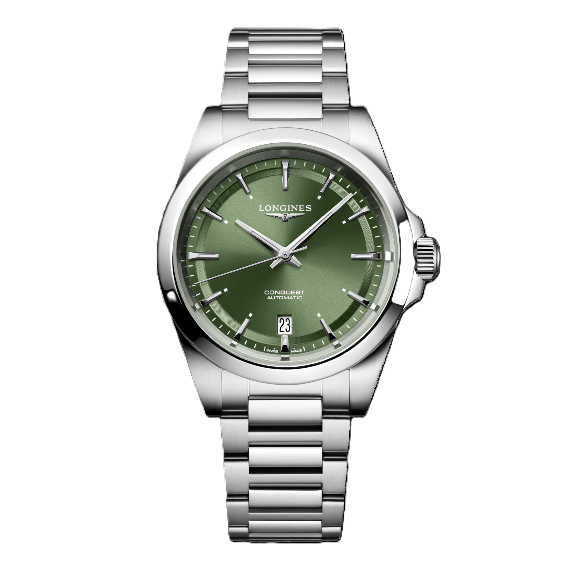 自動巻メカニカルムーブメントであるロンジン独自のL896.5キャリバーを搭載し、文字盤中央に配された回転ディスクにはパワーリザーブが表示されます。コンクエスト コレクションの70周年を記念して、ブラックの文字盤にブラックのアリゲーターレザーストラップを組み合わせ、アイコニックなモデルを再解釈しています。